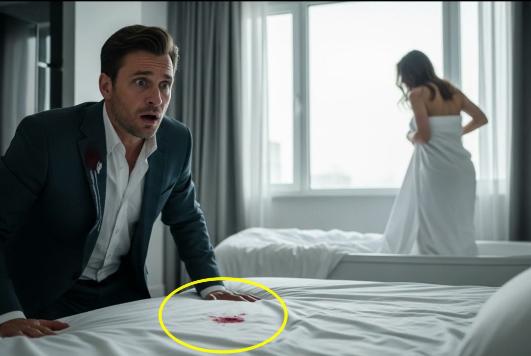 And blood—dark, smeared along the sheet’s edge, vanishing into the folds around her legs.