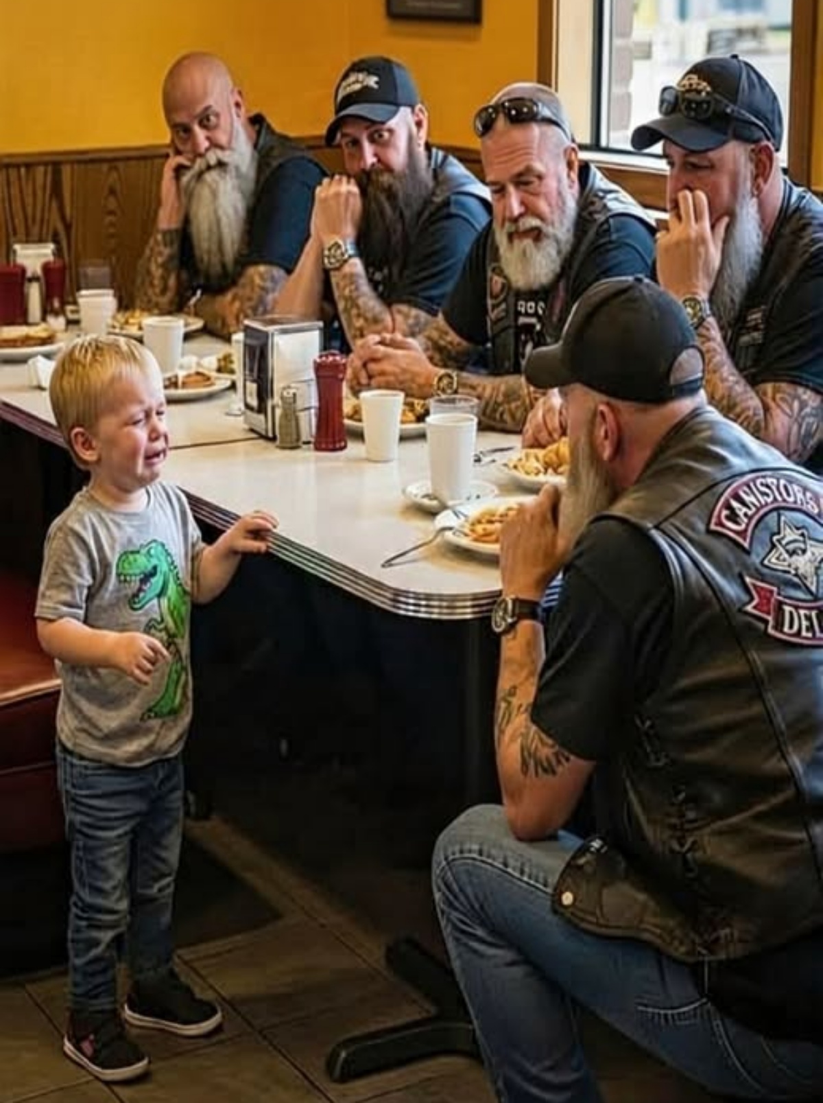 When that boy, Tyler, walked into our biker club’s favorite diner clutching seven crumpled dollars, every spine in the room snapped straight. Mothers at nearby tables paused mid‑bite. The waitress dropped a plate. Even the neon sign flickered as if sensing the weight of what was about to unfold.