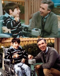 Jeff, just 10 years old, wheeled himself onto the set. His motorized chair hummed quietly across the floor as Fred Rogers knelt down to greet him.