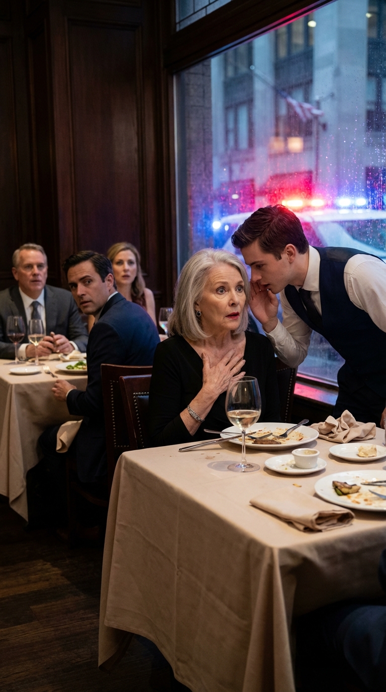 I was having dinner at an upscale restaurant with my daughter and her husband. After they left, the waiter leaned down and whispered something that made me freeze in my seat. Moments later, flashing lights filled the windows outside…